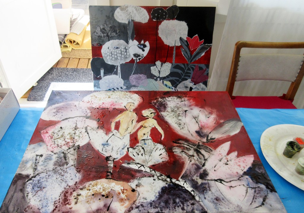 Otin malleiksi piirustuskurssilla tekemäni kollaasit. Niitä riittää. Olin nimittäin tosi ahkera. Kaksi ensimmäistä 50 x 70 cm kokoista maalausta on nyt jossain vaiheessa. Niitä voi vielä jatkaa öljyväreillä. Sitten työhuoneella. Ei kotona.
