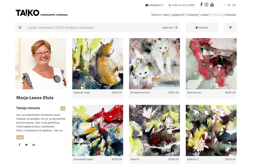 Minulla oli ihana aamu. Sain taas kerran Taikosta viestin: ”Taideteoksesi on myyty”. Se oli uskonvahvistusta. Olen maalannut parin viime vuoden aikana akvarelleja lomamatkoillamme. Parhaat niistä ovat olleet tänä keväänä esillä kahdessa näyttelyssä. Olen saanut kiitosta mutta kauppoja ei ole syntynyt.