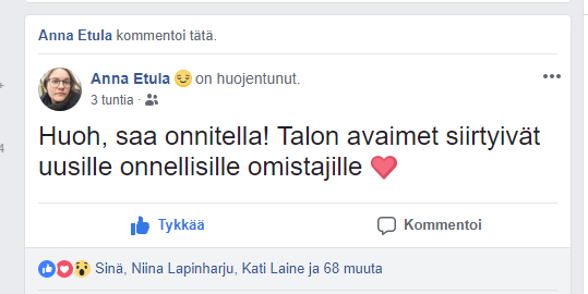 Olemme kaikki todella helpottuneita, että talo meni kaupaksi. Suurella rahalla siitä olisi saanut unelmakodin, mutta sitä rahaa ei kenelläkään ollut. Jussi on viettänyt monta unetonta yötä talohanketta murehtiessaan.