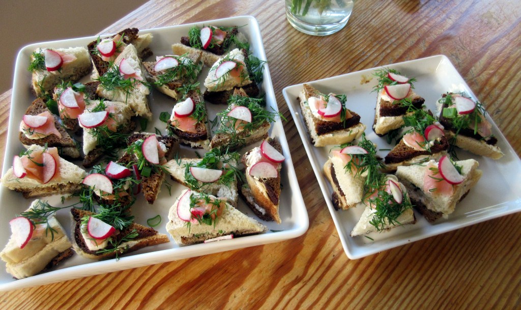 Valmistin tonnakala-, piparjuuri- ja retiisitäytteet tuorejuuston ja creme fraisen kera. Sivelin täytteet paahto-, ruis- ja saaristoleipäviipaleille ja annoin vetäytyä jääkaapissa yön yli. Leikkasin aamulla leivät kolmioiksi ja koristelin kylmäsavulohella, ohuilla retiisinviipaleilla sekä tuoreella tillillä. Näitä voi kokeilla toisenkin kerran kesäjuhlissa tai vaikkapa piknikillä.