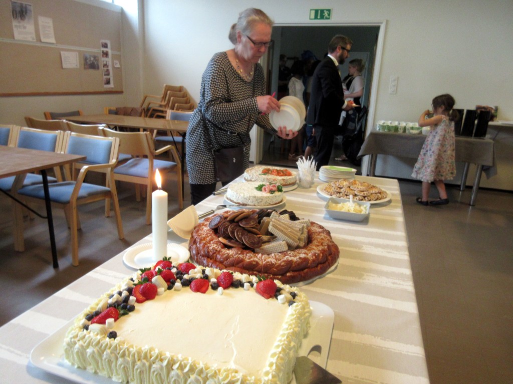 Laura-kakkumestari leipoi kaksi suurta täytekakkua ja hänen Leila-äitinsä toi Laviasta voileipäkakkuja ja komean pullakranssin.