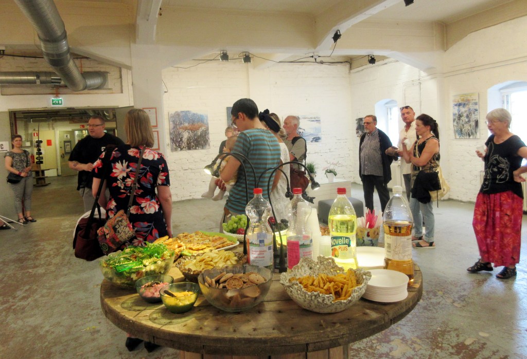 Naapurihuoneessa oli samaan aikaan esillä Riitta Virtasen öljyväritöitä. Se oli hyvä, sillä sen myötä mekin saimme grafiikannäyttelyymme runsaasti avajaisvieraita.