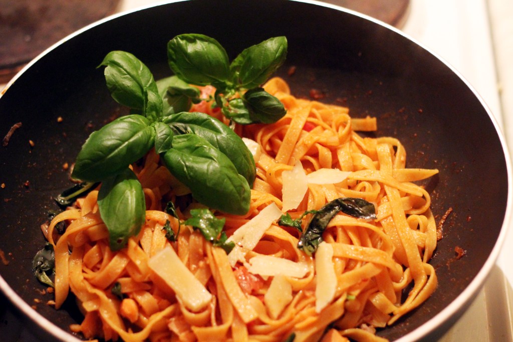 Leikkasin runsaan kourallisen basilikanlehtiä pieniksi ja lisäsin ne pastaan. Lopuksi mukaan pääsi savulohi. Annoksesta tuli värikäs ja maistuvainen.