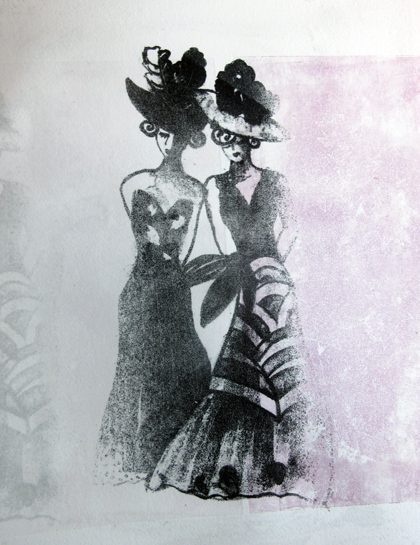 Minun neitossarjalleni ei näy loppua. Ehkäpä ripustan joskus litografianäyttelyn, jossa romanttiset tyttöset kilpailevat mekkojensa kauneudesta. Kävin tänään telaamassa tuoreille vedoksille vaaleanpunaiset sävytaustat. Onnistuneita vedoksia on vain kolme. Nämä ovat siis lähes uniikkeja.