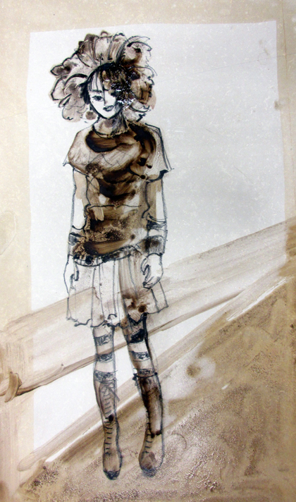 Minulla on piirrettynä seuraavakin aihe. Mekko on maalattu litografiatussilla. Miten se käyttäytyy, sen näen vasta seuraavalla vedostuskerralla. Toivottavasti se on pian.