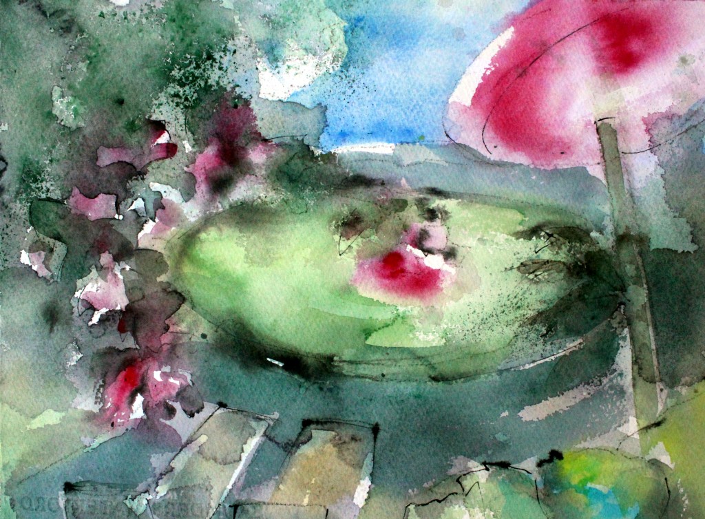 Vietimme aurinkoisen ja tuulisen viikon Korfulla syyskuun alussa 2018. Maalasin parvekkeellamme näkymiä pihapiiristä ja lähiympäristöstä. Tuuli kiidätti paperilautasiani pitkin pihanurmikkoa. Yöllinen rankkasade kasteli koko parvekkeen ja aamulla sekä akvarellit että värit uivat vesilammikossa. Se ei tahtia haitannut. Tässä tuoreita – ei enää märkiä – kuvia vihreältä saarelta.