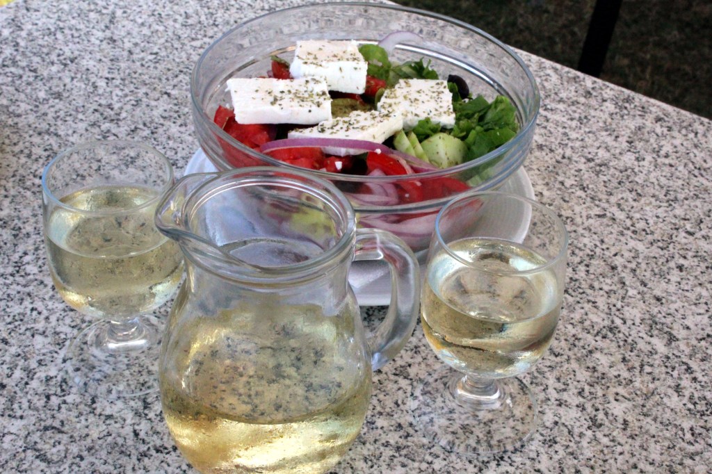 Istahdimme Mare Deus rantatavernaan ja tilasimme kreikkalaisen salaatin ja sen kaveriksi karahvin valkoviiniä. Emme pettyneet, maku ja hinta olivat kohdallaan.