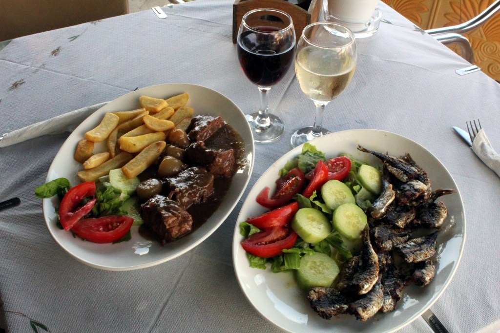 Päivän tarjous oli stifado ja lasi viiniä 8 euroa. Se sopi Jussille. Minä tilasin tuoreita sardiineja salaatin kera 7 euroa ja olin kovasti tyytyväinen.