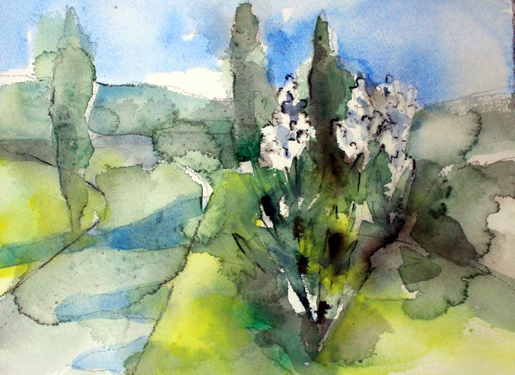 Pääsin jo eilen akvarellimaalauksen makuun. Viimeistelin aamulla ensimmäisen työn. Siitä tuli heleän vihreä. Olen maalannut omalla parvekkeella. Siellä on sopivasti pöytä ja vesipiste on lähellä.