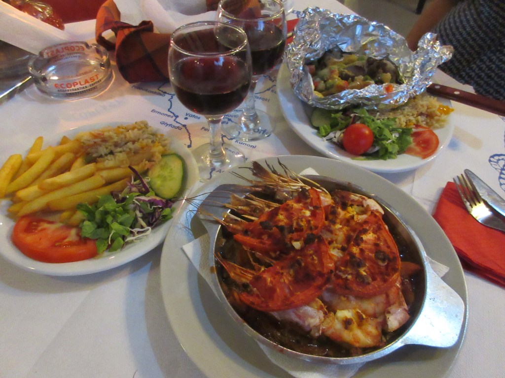 Jussi valitsi päivän tarjouksen: uunissa haudutettua fetapaistosta ja lammaskleftikoa sekä jäätelöä. Minä herkuttelin saganakiravuilla. Olimme oikein tyytyväisiä. Varsinkin kun talo tarjosi jälkiruuaksi vielä ekstralasilliset viiniä ja tuoreita hedelmiä.