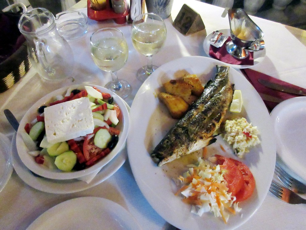 Naapurimme kehuivat Yiannis tavernaa. Suuntasimme siis sinne. Emmekä pettyneet. Kysyimme, oliko tuoretta kalaa. Listalla oli lueteltu kaloja pitkä rivi, mutta vain seabass – meriahven – oli tuoretta. Valinta oli siis helppo. Saimme kokonaisen kalan suoraan grilliltä pöytään. Se maistui ihanalta kreikkalaisen salaatin kera. Talo tarjosi vielä jälkiruuaksi herkulliset kakkupalat.