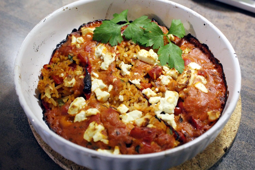 Valmistin täytteen sillä aikaa. Kypsensin pitkäjyväistä riisiä. Keittelin silputtuja tuoreita tomaatteja ja paprikoita sekä tomaattimurskaa ja sipulia kasvisliemessä. Maustoin kuivatuilla yrteillä sekä tuoreella rosmariinilla. Lisäsin kastikkeen joukkoon saganakikuutioita. Pehmensin makua kreikkalaisella jogurtilla ja puristetulla sitruunanmehulla. Pieni lisäys hunajaa antoi sopivaa pyöreyttä.