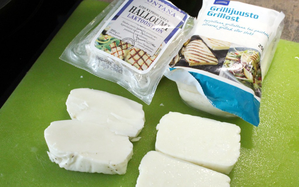 Paistoin meille koeannokset. Halloumi osoittautui selvästi maukkaammaksi kuin salaattijuusto. Niinpä se pääsee huomenna pannulle, kun vieraat tulevat.
