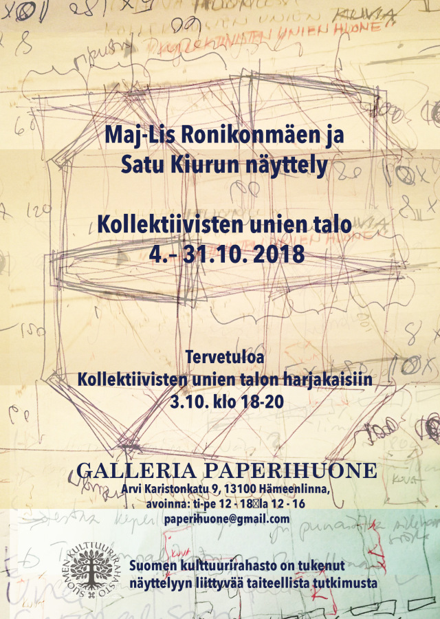 Satu ja Vanajaveden opiston eläkkeellä oleva opettaja Maj-Lis ovat Galleria Paperihuoneen lokakuun taiteilijoita. Vietämme tänään ”Kollektiivisten unien talon” harjakaisia. Satu ja Maj-Lis ovat Paperihuoneen perustaja- ja kunniajäseniä. Meille on kunnia saada heidän näyttelynsä nyt Hämeenlinnaan.