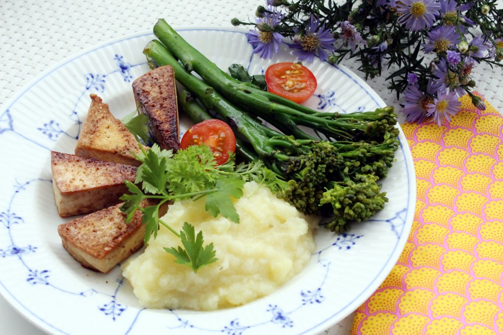 Kokkasin meille kahdelle syksyisen annoksen. Käytin juuresmuhennokseen perunoiden ja palsternakan lisäksi keltasipulia ja lehtipersiljaa. Parsakaalin kiehautin nopeasti vedessä ja paahdoin sen jälkeen tofuviipaleiden kera oliiviöljyssä pannulla.