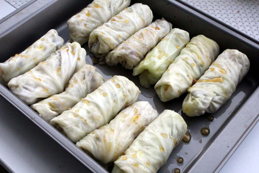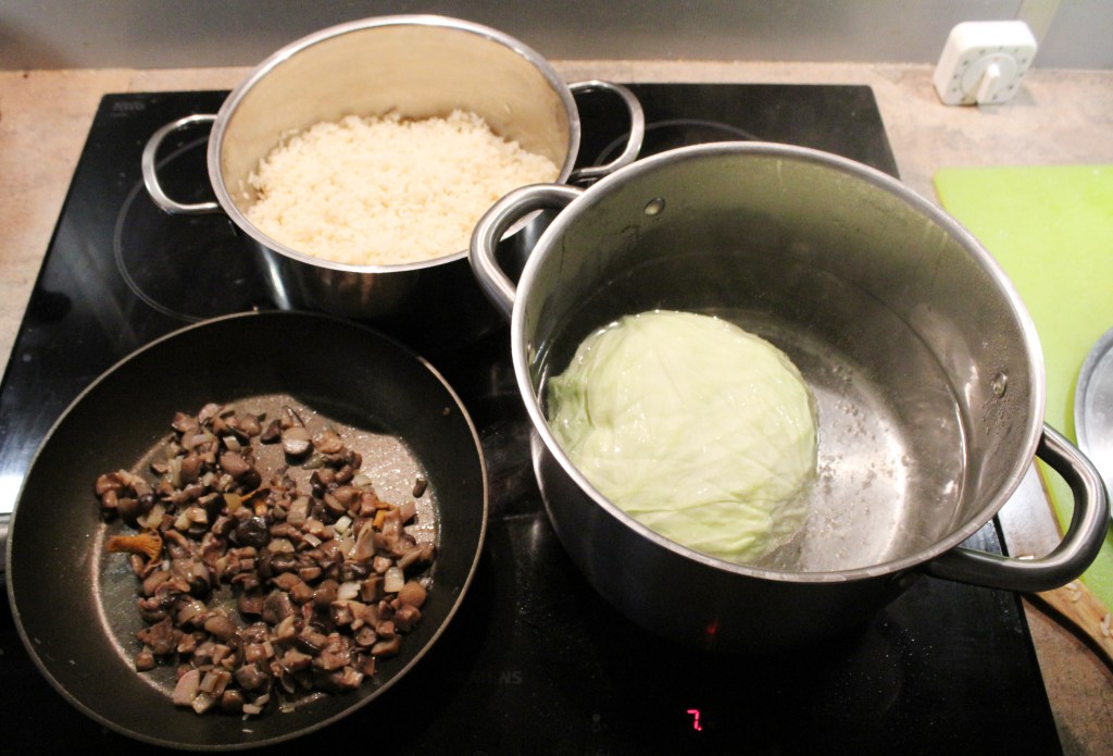 Innostun joka syksy kokkaamaan kaaliruokia. Olin urhea ja kokeilin, miten kaalikääryleiden teko onnistuu. Kohtalaisesti, ei loistavasti. Pinta ruskistui vähän liikaakin. Näin ne tein. Koversin litteästä kaalinkerästä kovan kantaosan pois. Keittelin kaalin lähes kypsäksi ja irrotin lehdet yksitellen. Pienet keskiosan lehdet hienonsin voitattien, sipulin ja riisin joukkoon.