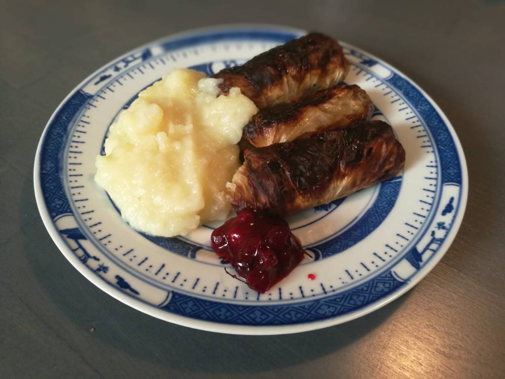 Paistoin 15 minuuttia 225 asteessa ja vähensin sitten lämpöä 175 asteeseen. Valelin välillä paistoliemellä. Tunnin kuluttua väriä oli ja kääryleet kypsiä. Tarjosin perunamuhennoksen ja karpalohillon kera. Hyvältä maistui.