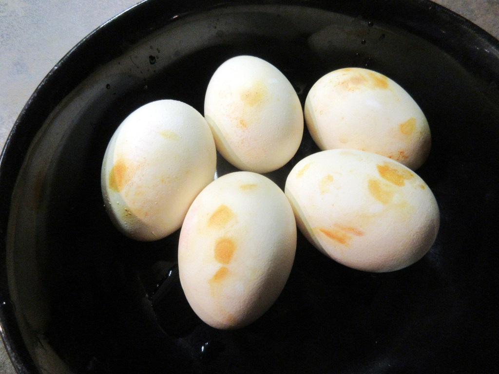 Mitenkähän kurkuma toimii kananmunien värjäyksessä? Kiehautin vettä ja kurkumanpaloja. Käärin munat tinapaperiin ja ripottelin väliin kurkuman paloja. Odotin kirkkaan keltaista lopputulosta. Munista tuli haalean keltaisia ja läikikkäitä. No, ainakin erilaisia kuin sipulinkuorilla värjättäessä.
