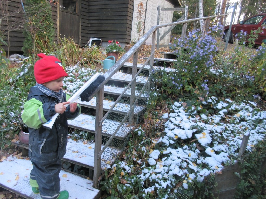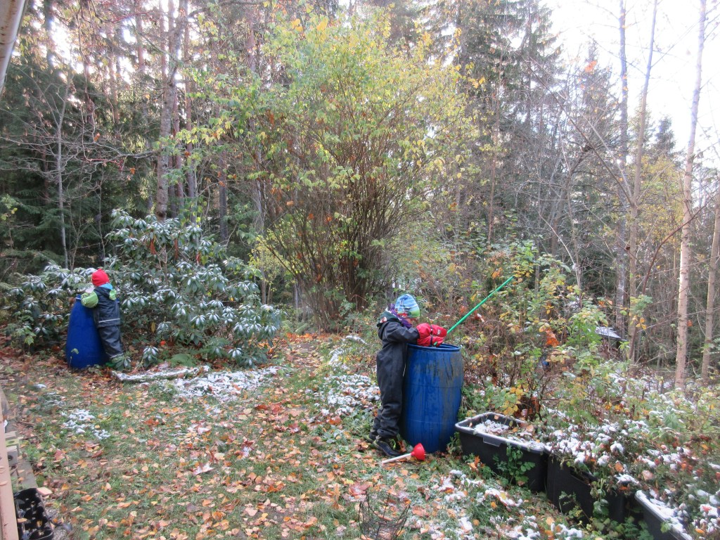 Minä puuhailin ulkohommissa. Niin pojatkin. Vesitynnyreissä oli ohut jääpeite. Pojat olivat hetkessä litimärkiä, kun he rikkoivat jäätä ja kantoivat sitä leikkeihinsä.