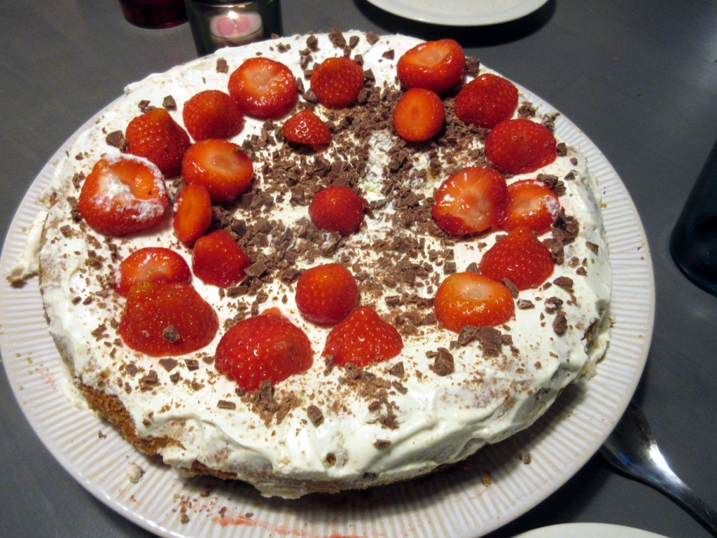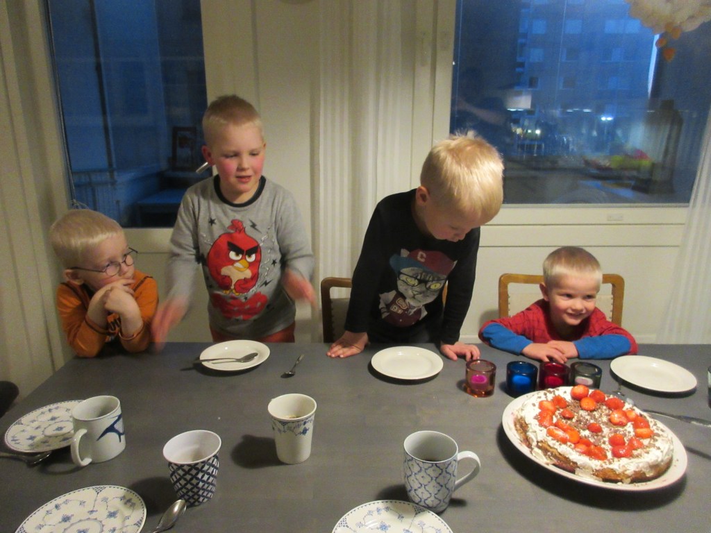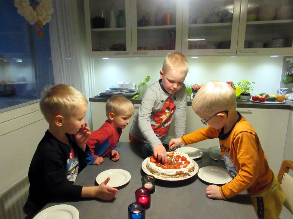 Palasimme illan edellä punaposkisina kaupunkiin. Ruuan jälkeen oli juhlahetki. Olin täyttänyt kakkupohjat yhdessä Samun ja Miskan kanssa edellisenä iltana.