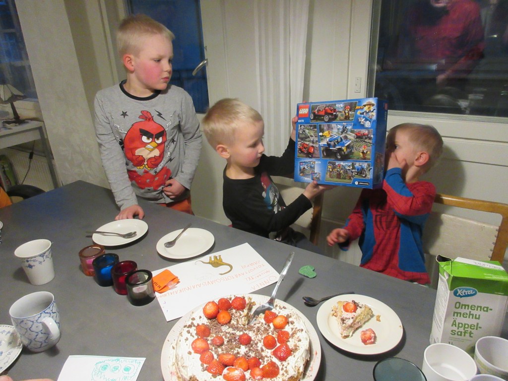 Miska sai puhaltaa neljä tuikkukynttilää. Sen jälkeen lauloimme, herkuttelimme ja annoimme lahjat. Otso ja Visa olivat piirtäneet hienot kortit. Isosta paketista löytyi toivelahja – legopaketti.