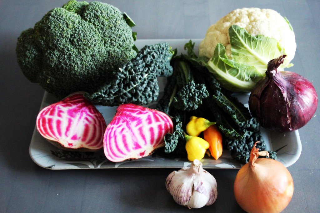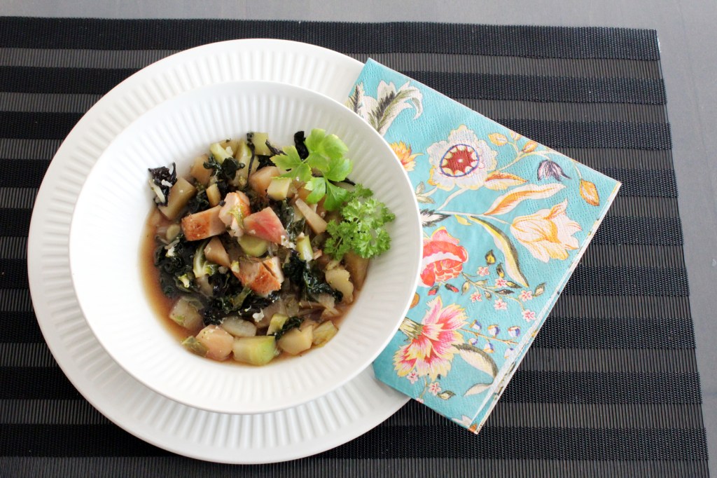 Maku oli miedompi kuin punajuuren. Kuullotin raitajuurta ja sipulia oliiviöljyssä pannulla. Pilkoin kukkakaalin ja parsakaalin lohkoiksi. Kiehautin ne, kourallisen kuivattuja mustatorvisieniä sekä pannukasvikset ja silputun lehtikaalin suolalla maustetussa vedessä. Lisäsin soijakastiketta ja tuoreita yrttejä.