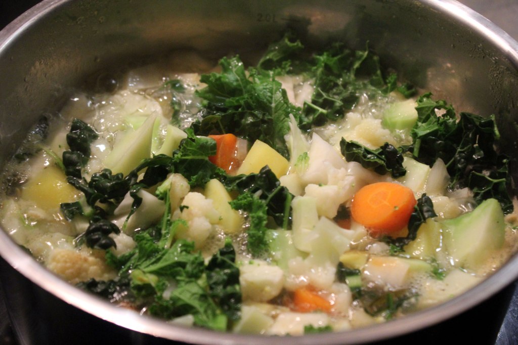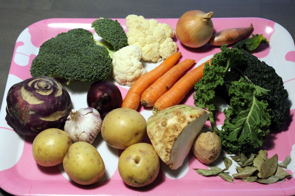 Pilkoin muutaman perunan, palan mukulaselleria, puolikkaan kyssäkaalin, ison sipulin, palan inkivääriä, porkkanoita, kukka- ja parsakaalia sekä lehtikaalia.