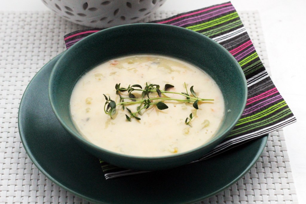 Lohkoin keltajuuret, muutaman jauhoisen perunan, suuren sipulin ja vähän porkkanaa väriä antamaan. Keittelin juurekset suolalla ja timjamilla maustetussa vedessä kypsiksi. Soseutin kevyesti, lisäsin yrttisuolaa ja mustapippuria myllystä.