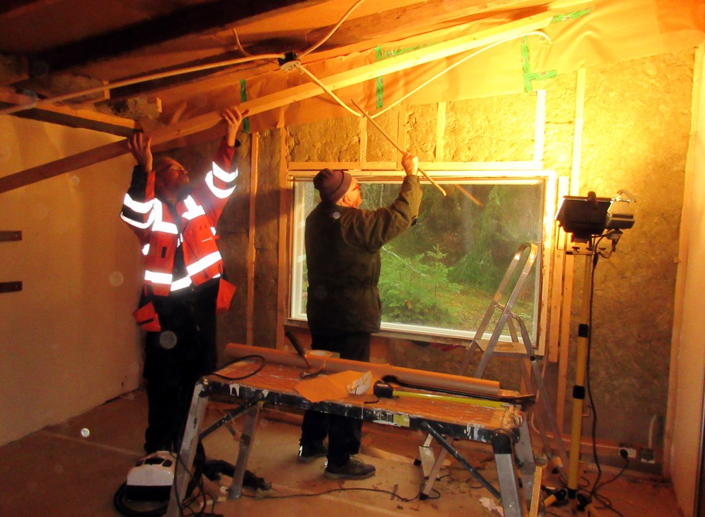 Olohuoneessa oli meneillään seinien ja katon villoitus. Siis nyt enemmän rakentamista kuin purkamista. Kirvesmies Pekka osoittautui mukavaksi ja huumorintajuiseksi. Työpäivä sujui reippaasti.