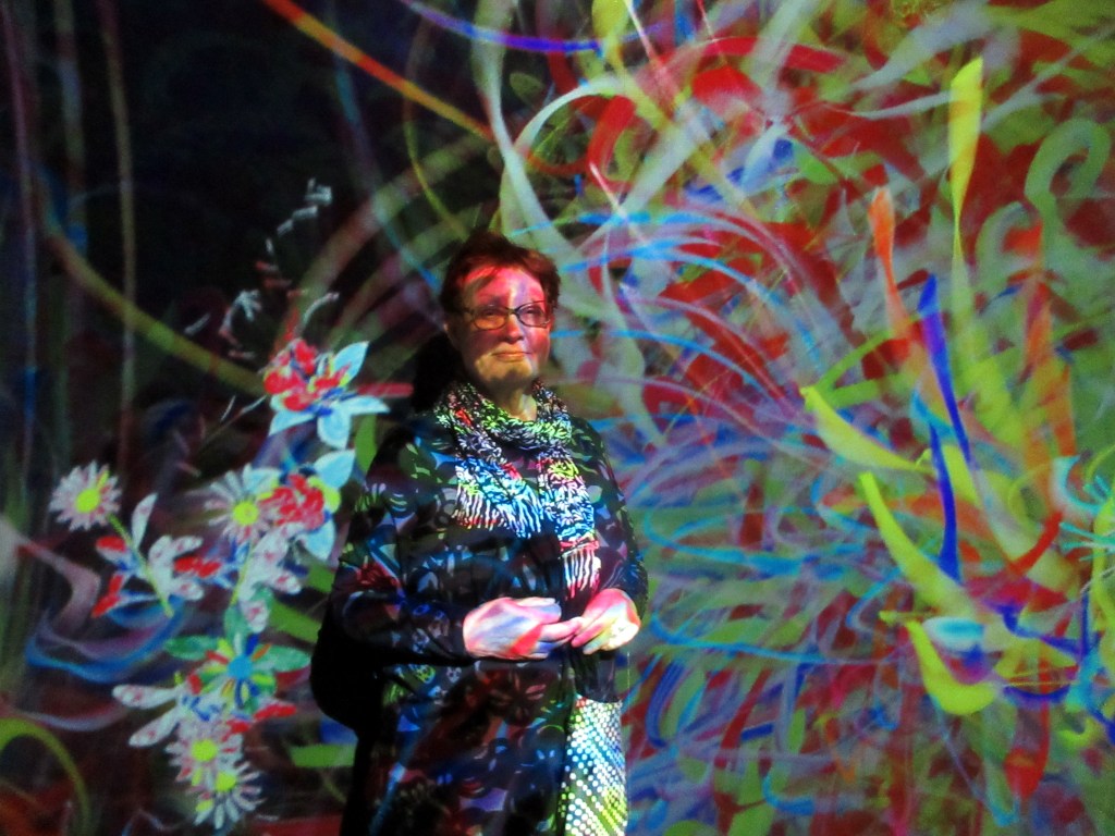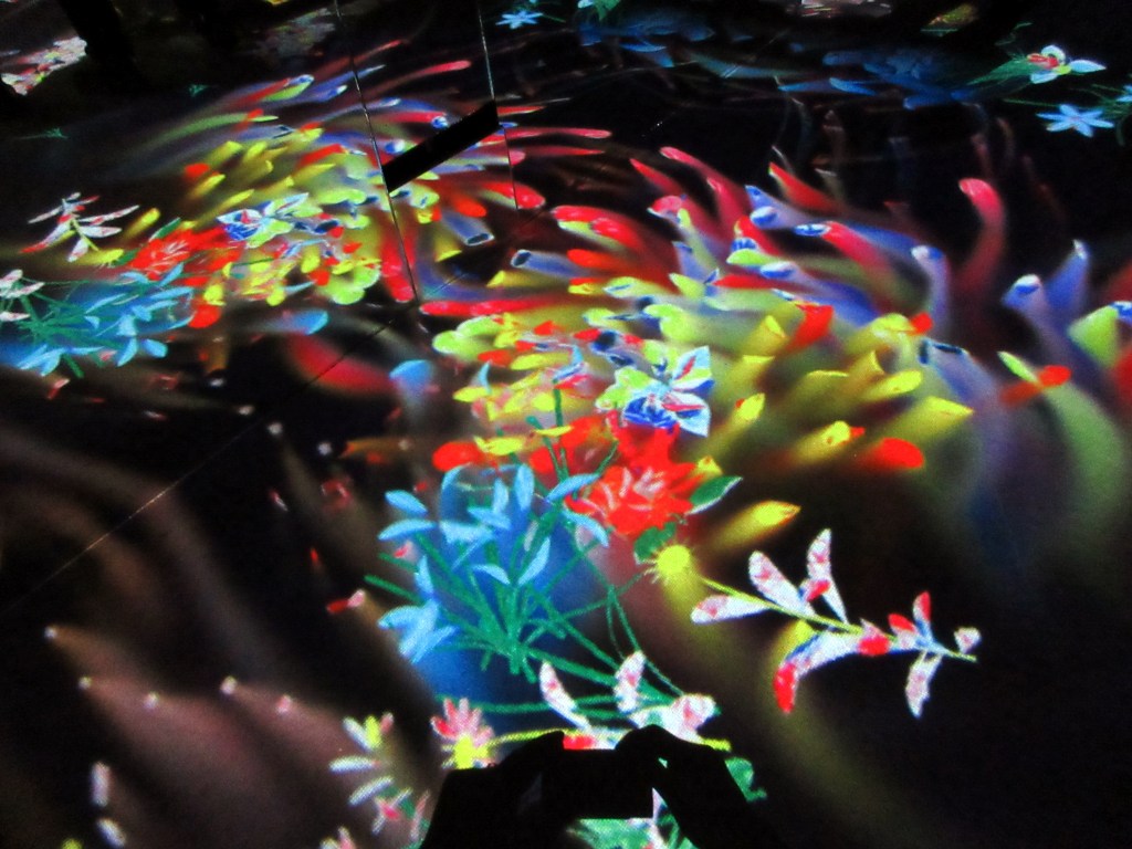 Kukkameri seuraavassa salissa hurmasi. Tila oli pimeä. Videoteokset pääsivät loistavaan sateenkaaren väreissä.