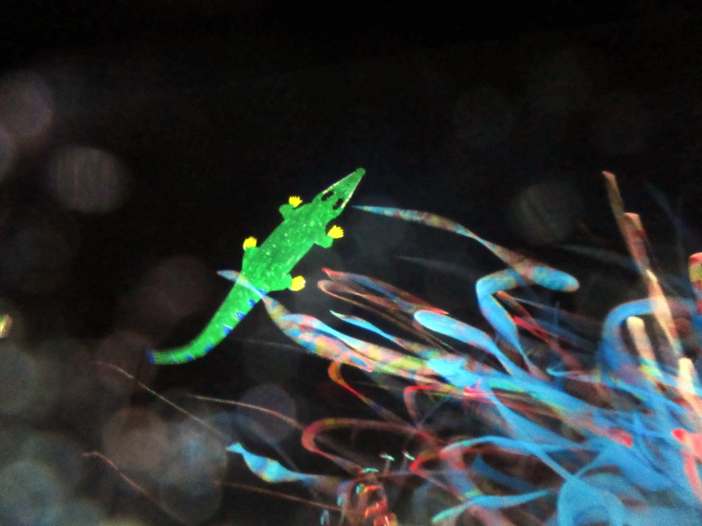Entäpä sitten liskot. Niitä vaelsi niin seinillä kuin lattiallakin. Jotkut olivat kasvaneet jättisuuriksi. Kukkien keskellä lepatti värikkäitä perhosia ja sammakot loikkivat villisti. ”Hei nämä ovat lasten piirtämiä”, tiesi joku kurssikavereista.
