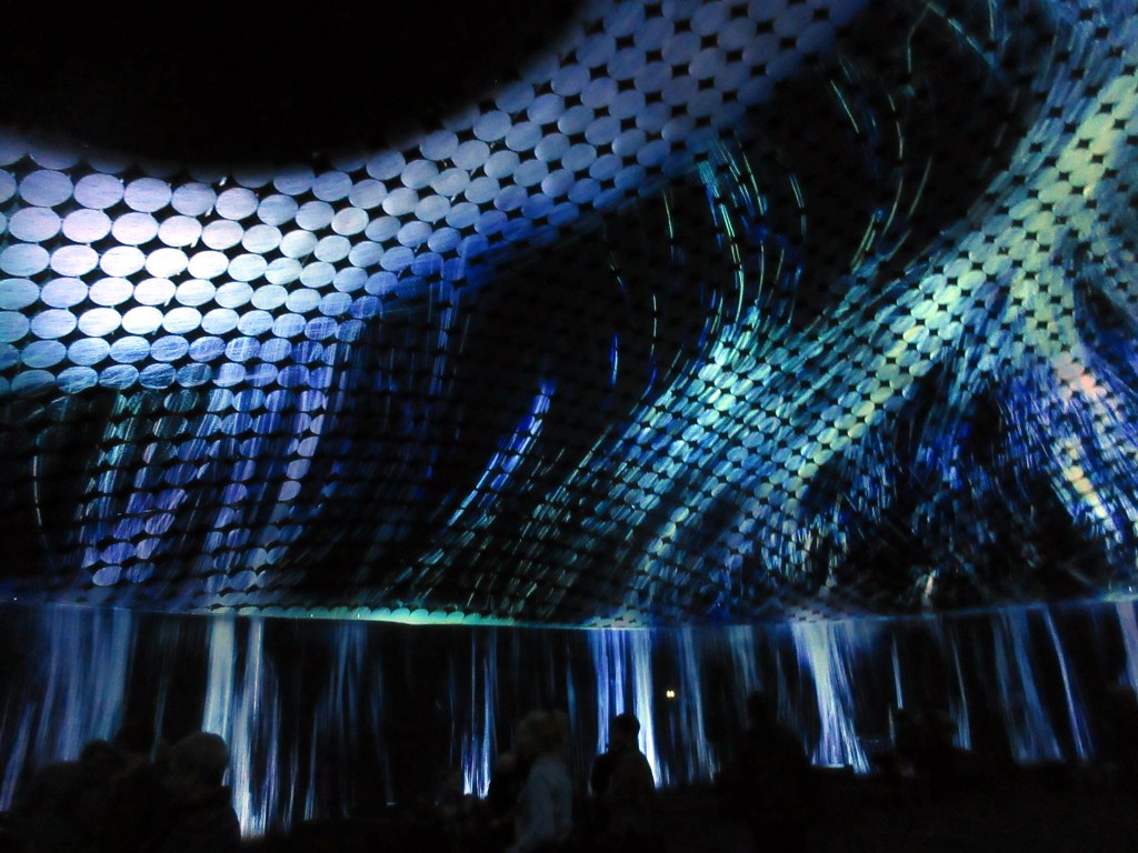 Olo oli seesteinen kun jonotimme perimmäiseen saliin. Siellä oli luvassa viiden minuutin video ja äänishow. ”Tämä ei ole pelottava, mutta välkkyvät valot ja kaikuva musiikki voivat laukaista migreenin, jos sellaiseen on taipumusta”, kultatakkinen opas varoitteli.
