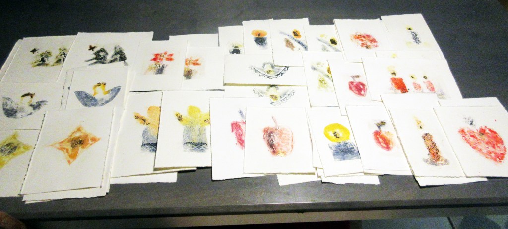 Märkä keli jatkuu. Kirjaimellisesti, sillä pulahdan puolen päivän aikaan vesijumppa-altaaseen. Olen urakoinut joulukortteja. En omia, vaan Hoiviassa asiakkaiden kanssa tekemiämme carborundumlaattoja. Vedostin niitä eilen grafiikanpajalla. Tänään lisään niihin vielä vähän lehtikultaa.