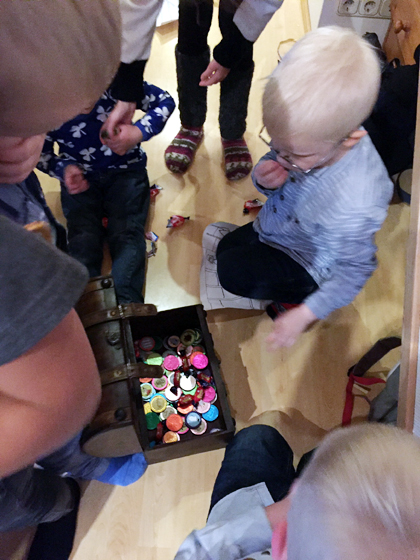Viimeisestä löytyi aarrearkku täynnä suklaisia kultakolikoita. Visa vartioi arkkua tarkasti. Kaikille riitti kolikoita kotiinviemisiksi asti.