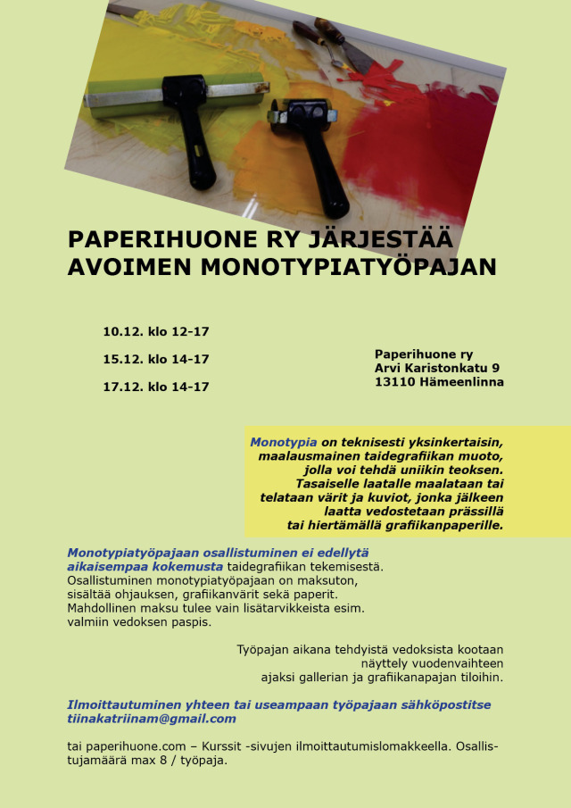 Niin ja on meillä joulunajan tapahtumiakin. Pop up taidekahvila ja joulutempaus. Näissäkin Tiina-Katriina ja minä olemme puuhanaisia. Raportoin aikanaan.