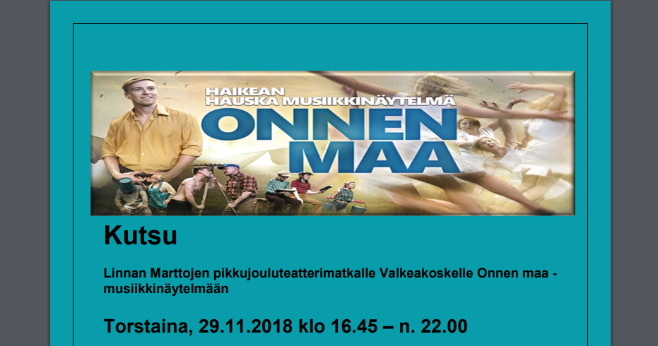 Näytelmä oli mukavan kotikutoinen. Siinä välittyi harrastajanäyttelijöiden tekemisen ilo. Tarinan edetessä muistin, että olen nähnyt sen elokuvaversiona. Se ei katsomista haitannut. Kotimatkalla bussissa oli tunnelmaa, kun me martat lauloimme joululauluja. Niin ja tiedossa on vielä yksi hauska marttailta. Maanantaina meillä on jouluaskartelua. Sopii minulle!