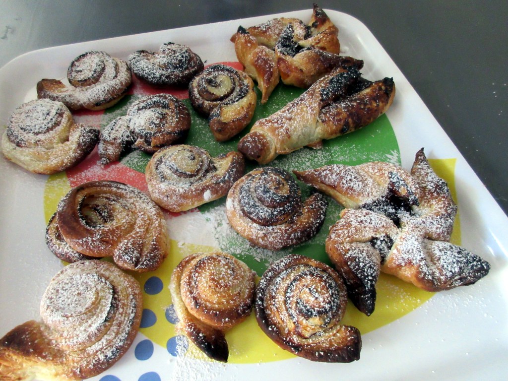 ”Nyt leivotaan”, Samu ja Miska hihkuivat, kun palasimme lämpimään kotiin. Niin me leivoimme. Voitaikina oli sopivasti sulanut ja pojat kaulivat sitä vauhdikkaasti. Levitimme väliin luumuhilloa ja pojat muotoilivat omia versioita joulutortuista. Pinta ehti saada uunissa vähän liiankin paljon väriä, mutta tomusokeri auttoi. Maku oli kohdallaan.