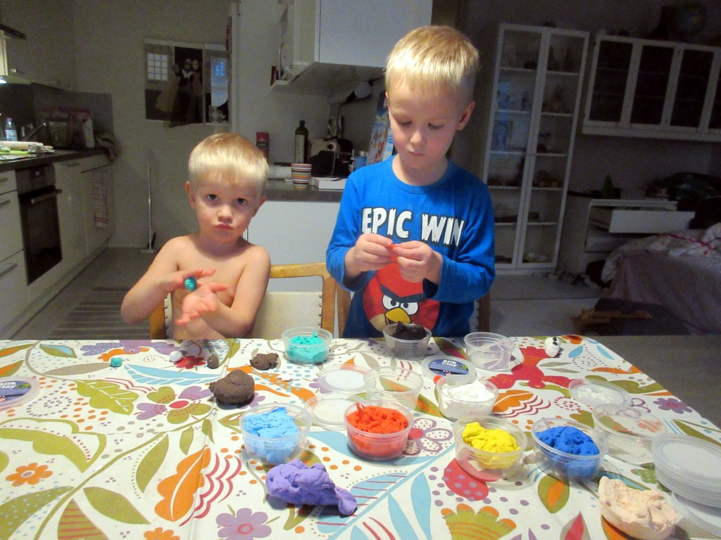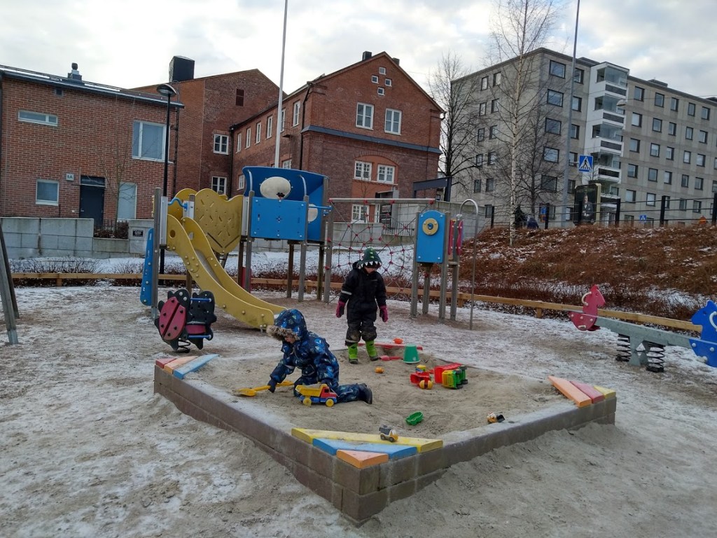 Minulla oli haasteellinen viikonloppu pikkupoikien kanssa. Anna ja Jussi puuhastelivat sekä lauantaina että sunnuntaina mökkiprojektin kimpussa. Suurin haaste oli saada pojat ulkovaatteisiin ja leikkipuistoon. Pukeminen kesti ikuisuuden, kun heillä oli koko ajan tärkeät leikit kesken. Ulkona puhalsi pureva tuuli, mutta se ei poikasia haitannut. Minä olin aivan jäässä tunnin leikkipuistokeikan jälkeen.