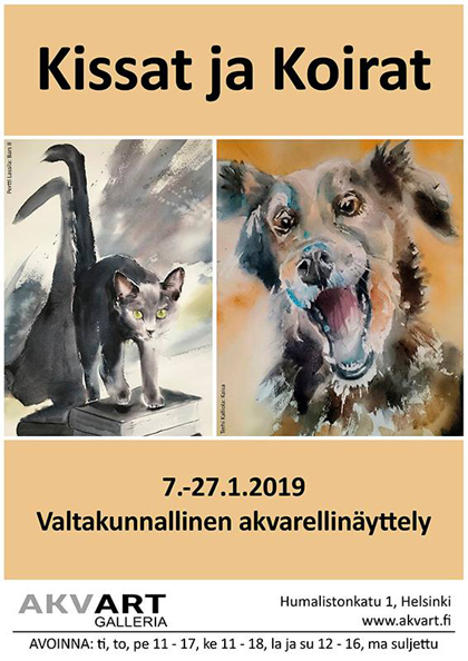 Juhlistamme ”Kissat ja koirat” -näyttelyn avajaisia illalla AkvArt galleriassa. Kissojen, koirien ja taiteen ystävät, tervetuloa juhlimaan kanssamme!