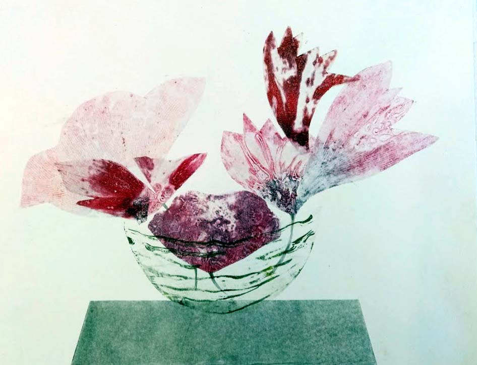 Meillä on grafiikanpajan puolella hulppea pino olutpahveja, joita käytämme kosteiden vedosten kuivattamiseen. Kun laitoin neitoseni painon alle, löysin yllättäen sinne unohtuneen kukkavedoksen.