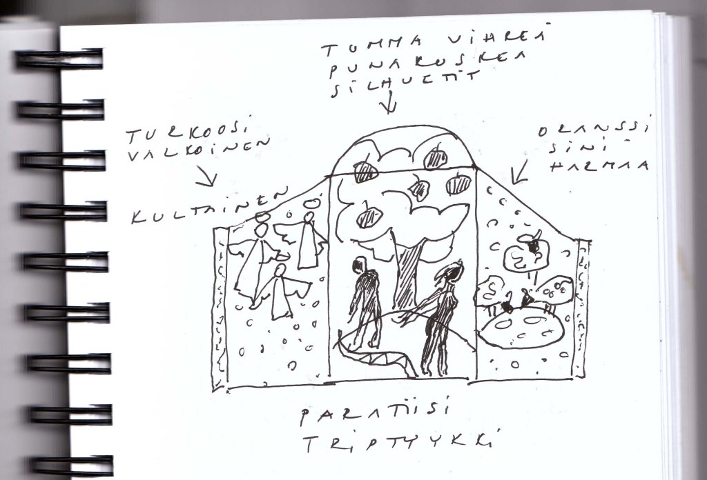 Minulla on vaatimaton suunnitelma – teen paratiisin. Keskelle Aatami, Eeva, omenapuu ja käärme. Toiselle sivulle enkeleitä, toiselle hyvä paimen -teeman mukaan lammaslauman. Aamuyöstä ei taas nukuttanut, kun mietin toteutusta.