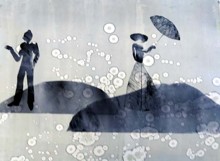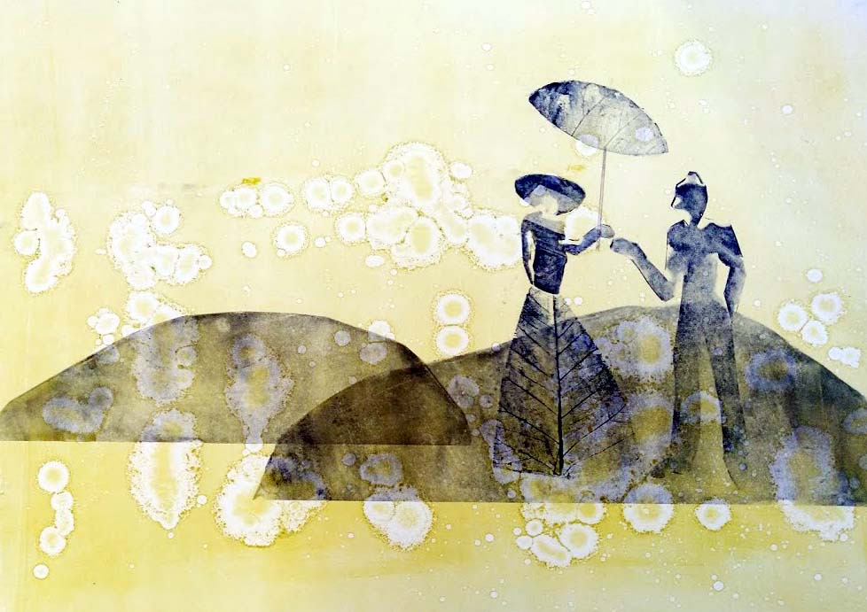 Tammi-helmikuussa 2019 oli aika tehdä kuvataiteen aineopintoihin kuuluvan praktikum-kurssimme päätehtävä. Se tarkoitti pientä sarjaa valitsemastaan aiheesta valitemallaan tekniikalla. Päätin käyttää mahdollisuuden kokeilemalla grafiikanmenetelmällä yksinkertaista tarinaa. Ensimmäisessä kuvassa nuori neito ja komea poika seisovat käsi kädessä vihreässä luonnossa.