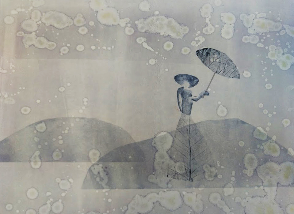 Toteutin kuvasarjan telaamalla väritaustat. Veden välkkeen sain aikaiseksi lamppuöljypisaroilla. Maiseman kalliot muotoilin offsetpellistä. Samoin neitosen ja pojan hahmot. Värit levitin telaamalla. Halusin lopputuloksesta pelkistetyn. Tehokeinoina oli vain värien valinta tunnelman mukaan.