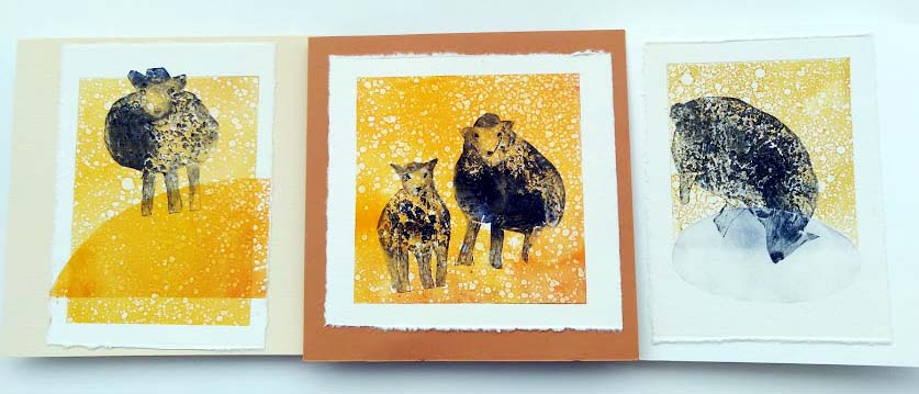 Askartelin grafiikkakortteja ja hyödynsin niissä lammaslaumaani. Huomasin, että nekin muodostivat hauskasti kolmeosaisen sarjan. Tässä siis bonustehtävä, joka noudattaa tehtävänantoa.