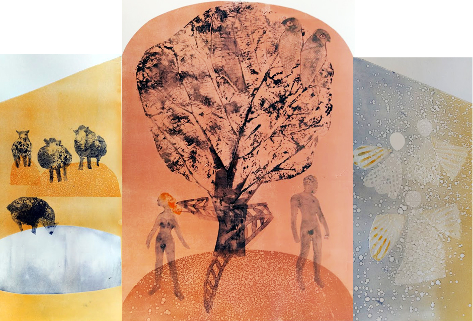 Minulle tuli ensimmäisenä mieleen alttaritaulu. Tapahtuman päähenkilöt esiintyvät keskellä ja molemmilla sivuilla on aiheeseen liittyviä kuvia. Miksi en tekisi aiheista perinteisimpää – paratiisia. Mutta en perinteisellä tekniikalla vaan pelkistettynä sarjana grafiikanmenetelmillä. Monotypia? Carborundum? Kartonkigrafiikka? Keskelle tietysti Eeva ja Aatami, omenapuu ja käärme. Sivuille tulee kukkiva puutarha ja eläimiä. Lampaita? Jos tähän yhdistäisi vielä hyvä paimen -teeman. Voisiko taivaalla lennähdellä pieniä enkeleitä?