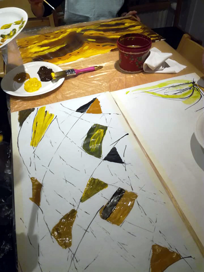 Idea oli, että sai käyttää vain inhokkivärejä. Lopputuloksesta päätellen se oli useimmilla ruskea. Katselukierroksella kaikki kirjoittivat spontaanisti muiden töistä sanan joka tuli siitä mieleen. Näistä kertyi kerrassaan hulvattomia runonpätkiä. ”Oli mukavaa”, oli yleisin kommentti taideterapiaillan jälkeen.