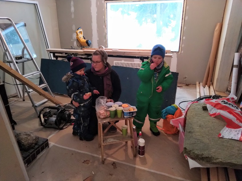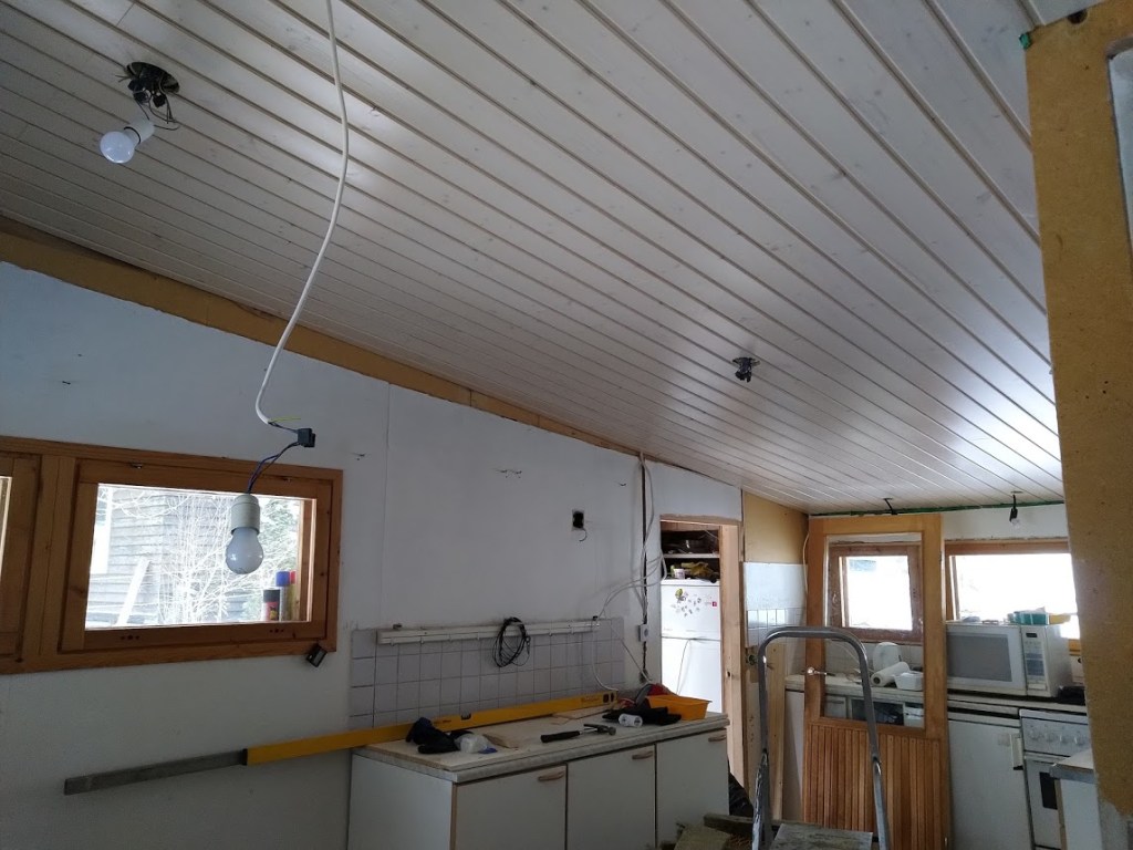 Kattoremontti on nyt valmis, mutta puuhaa riittää senkin jälkeen. Sähköjohdot pitää koteloida ja olohuoneen seinät levyttää. Anna on luvannut hoitaa sen jälkeen kittauksen ja maalausurakan. Ammattitaidolla. Mietimme jopa jotain koristetapettia olohuoneen päätyseinälle (!).