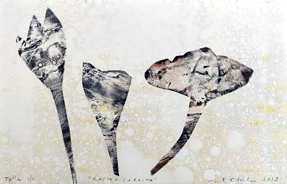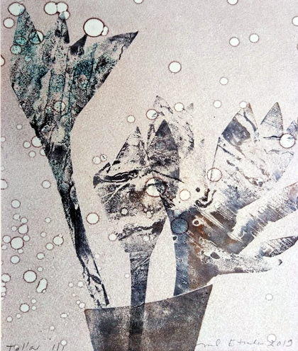 Oheiset teokset ovat syntyneet siis aika yksinkertaisesti. Olen telannut pinnalle syväpainoväriä ja vedostanut kukat grafiikanpaperille.