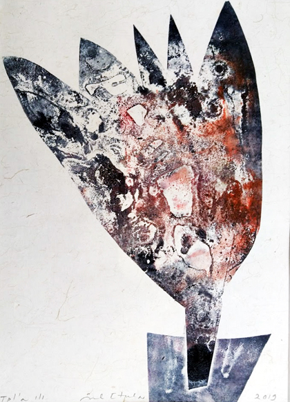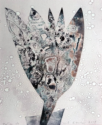 Ihastuin viime syksyn grafiikkakurssilla carborundum-tekniikkaan. Se on maalauksellinen grafiikanlaji. Offsetpellille rakennetaan struktuuria gesson, carborundum-hiekan ja liiman avulla. Pintaa voi käsitellä esimerkiksi palettiveitsellä, siveltimellä tai vaikka pahvinpalan avulla. Peltiä voi myös leikata muotoon.