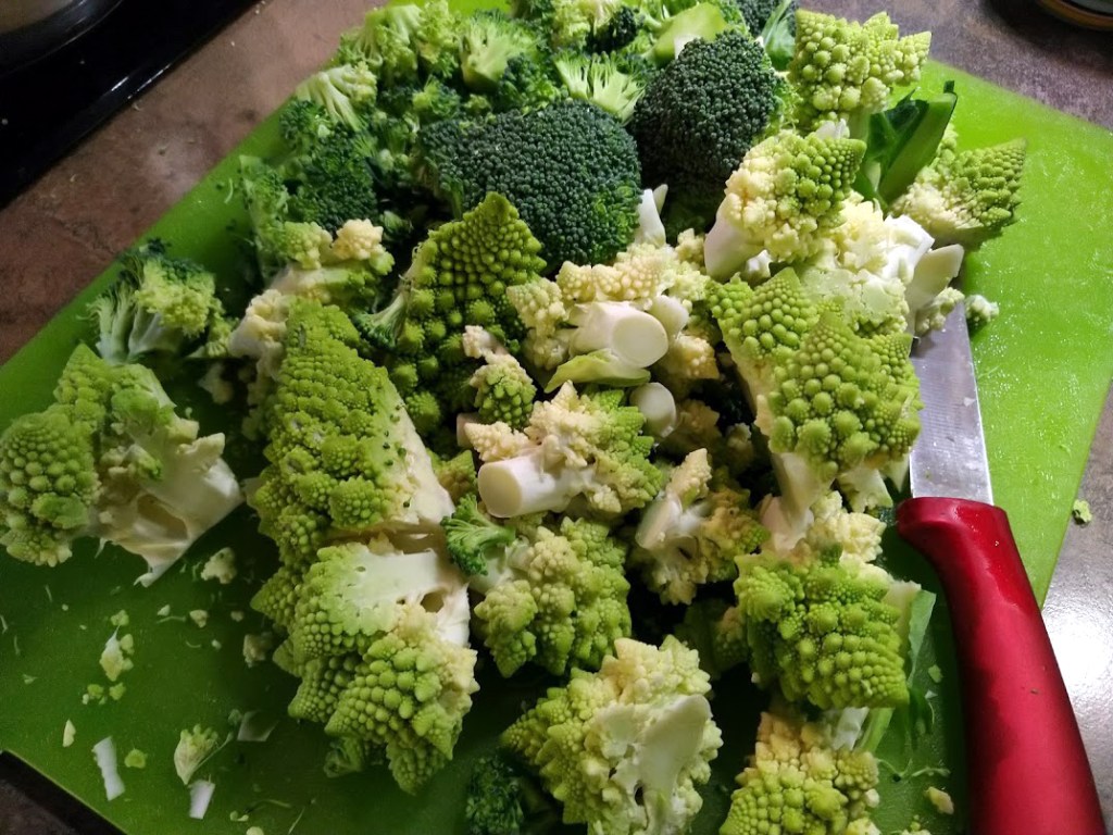 Ostin heleänvihreän romanesco-kaalin ihan vain sen hivelevän kauneuden vuoksi. Pilkoin sen sekä tummanvihreän parsakaalin.